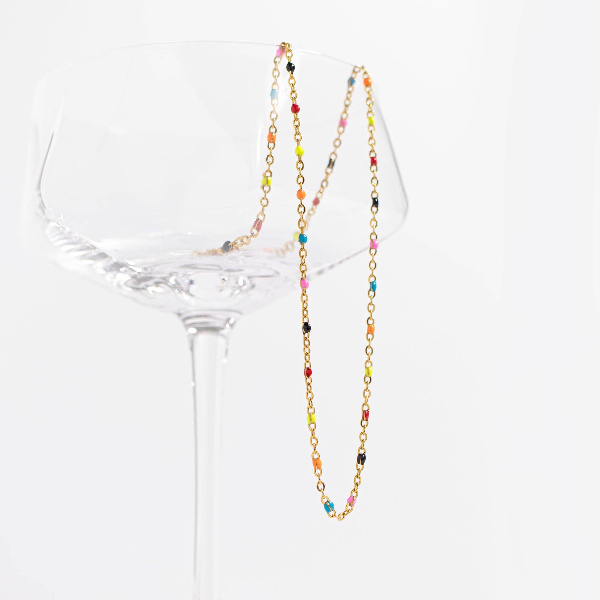 Playful yet polished, the multicolored confetti chain necklace brings a burst of color and shine to any look. Featuring vibrant enamel accents on a sleek 18K gold PVD stainless steel chain, it's lightweight, tarnish-resistant, and perfect for adding a fun twist to your everyday stack. Wear it solo or layered—either way, it’s a party.
