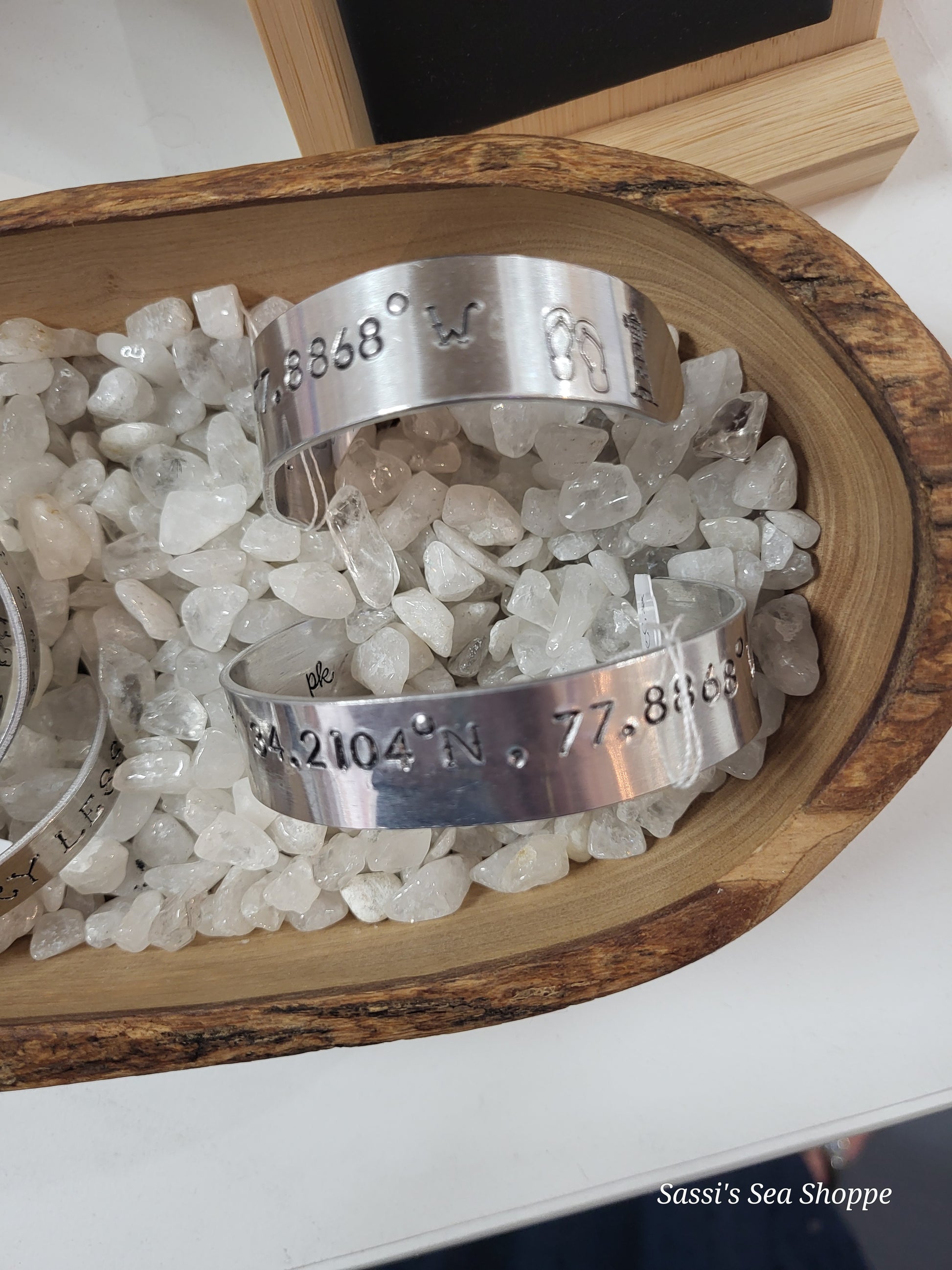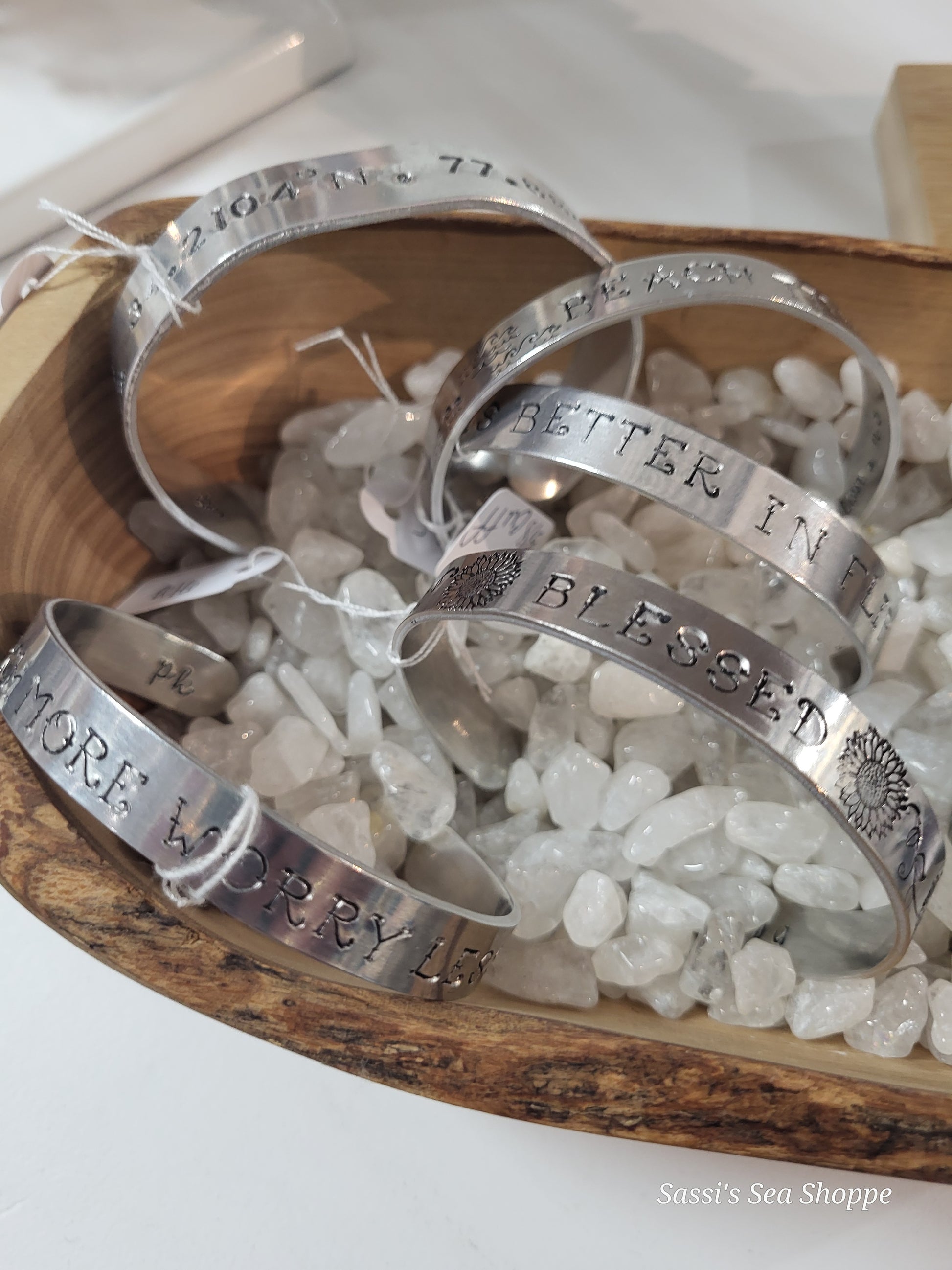 Assorted designs and phrases stamped into 5/8" wide aluminum cuff