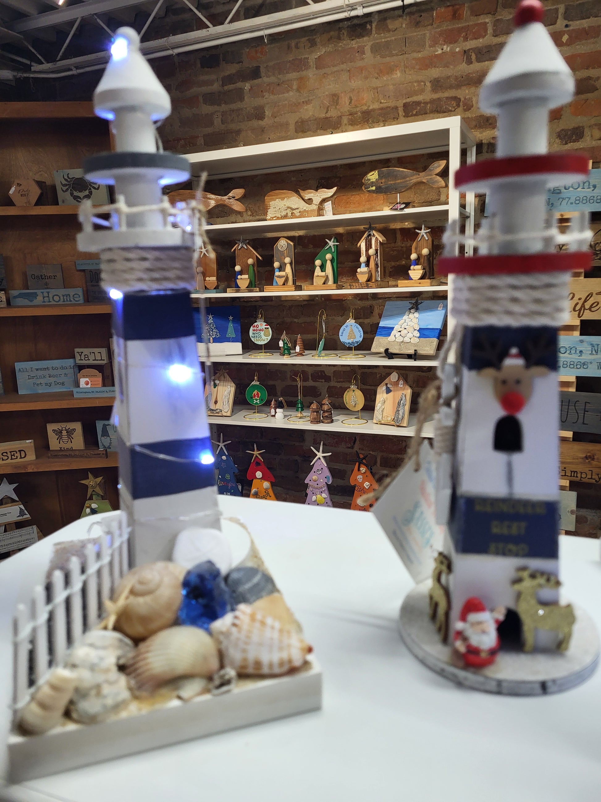 Assorted lighthouse decor in a beachy or holiday theme.