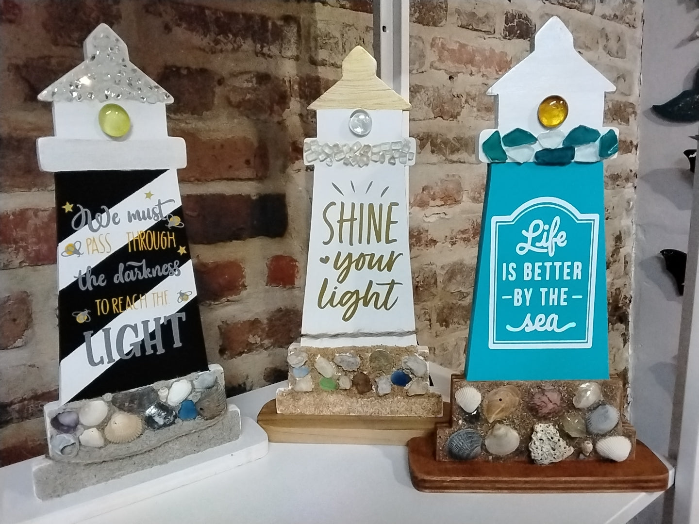 Hand-cut wood lighthouse painted in asst colors and coastal accents