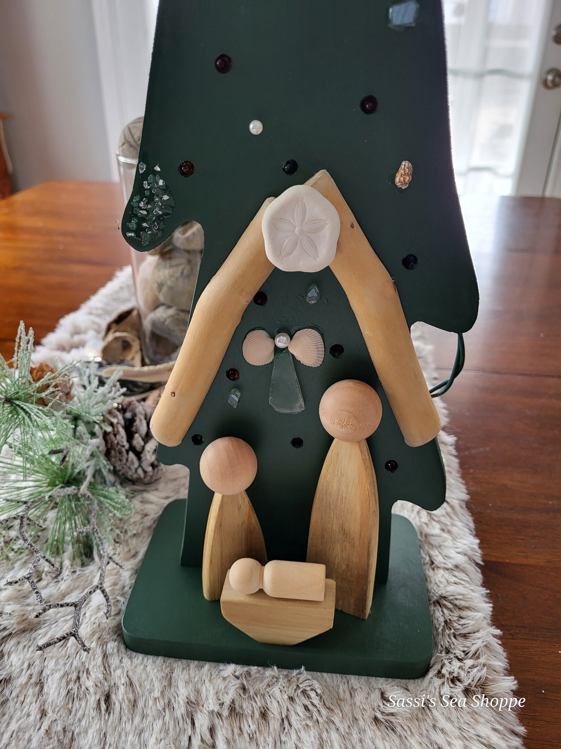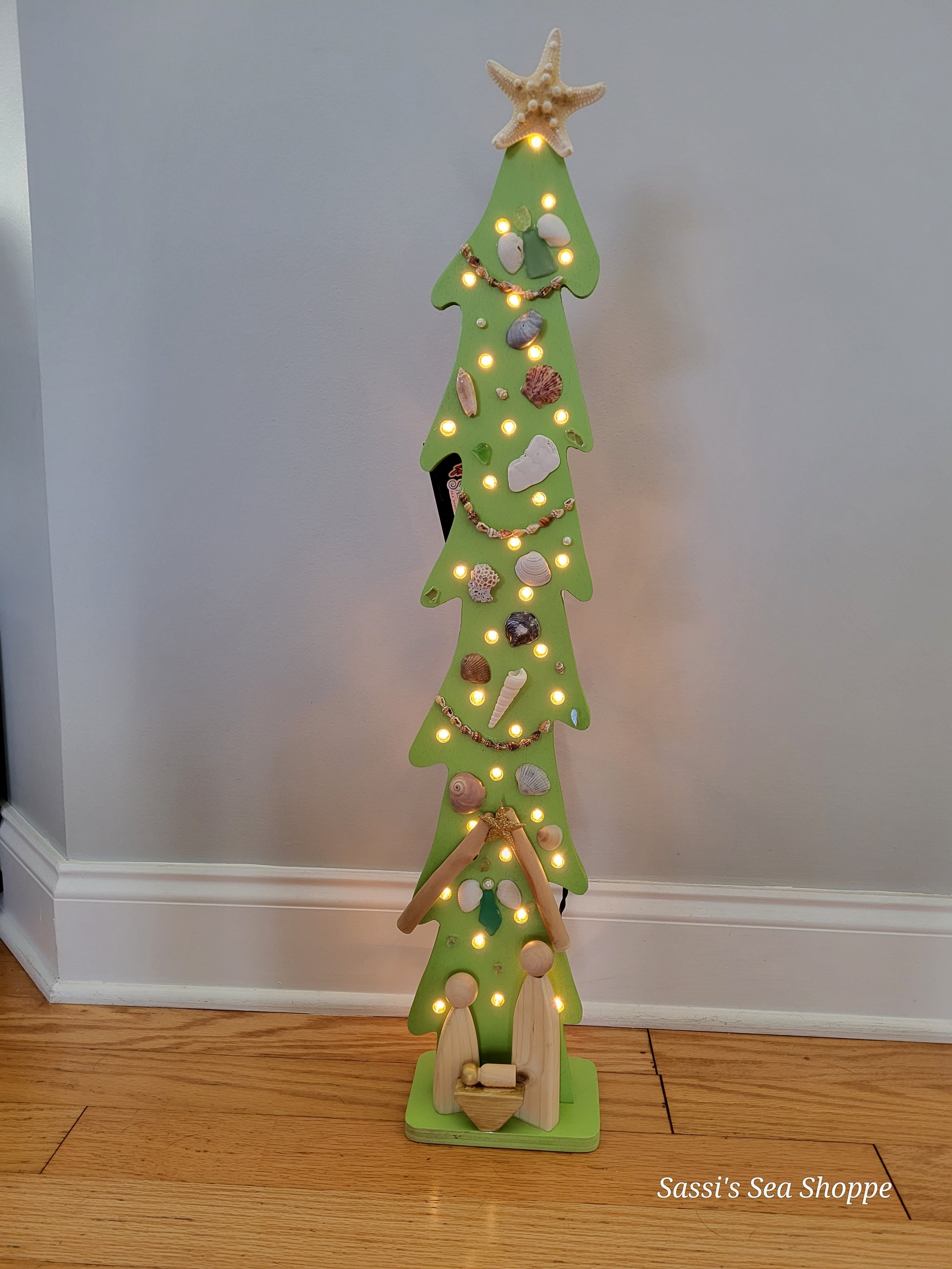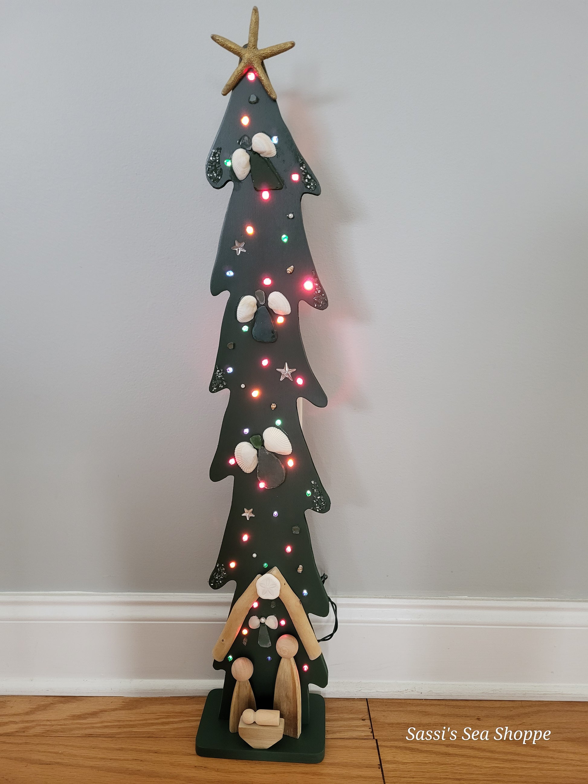 Hand cut plywood Skinny NativiTree 29" tall. Assorted colors using seashells, sea glass, sand & different materials with a custom-made Nativity scene on the base.