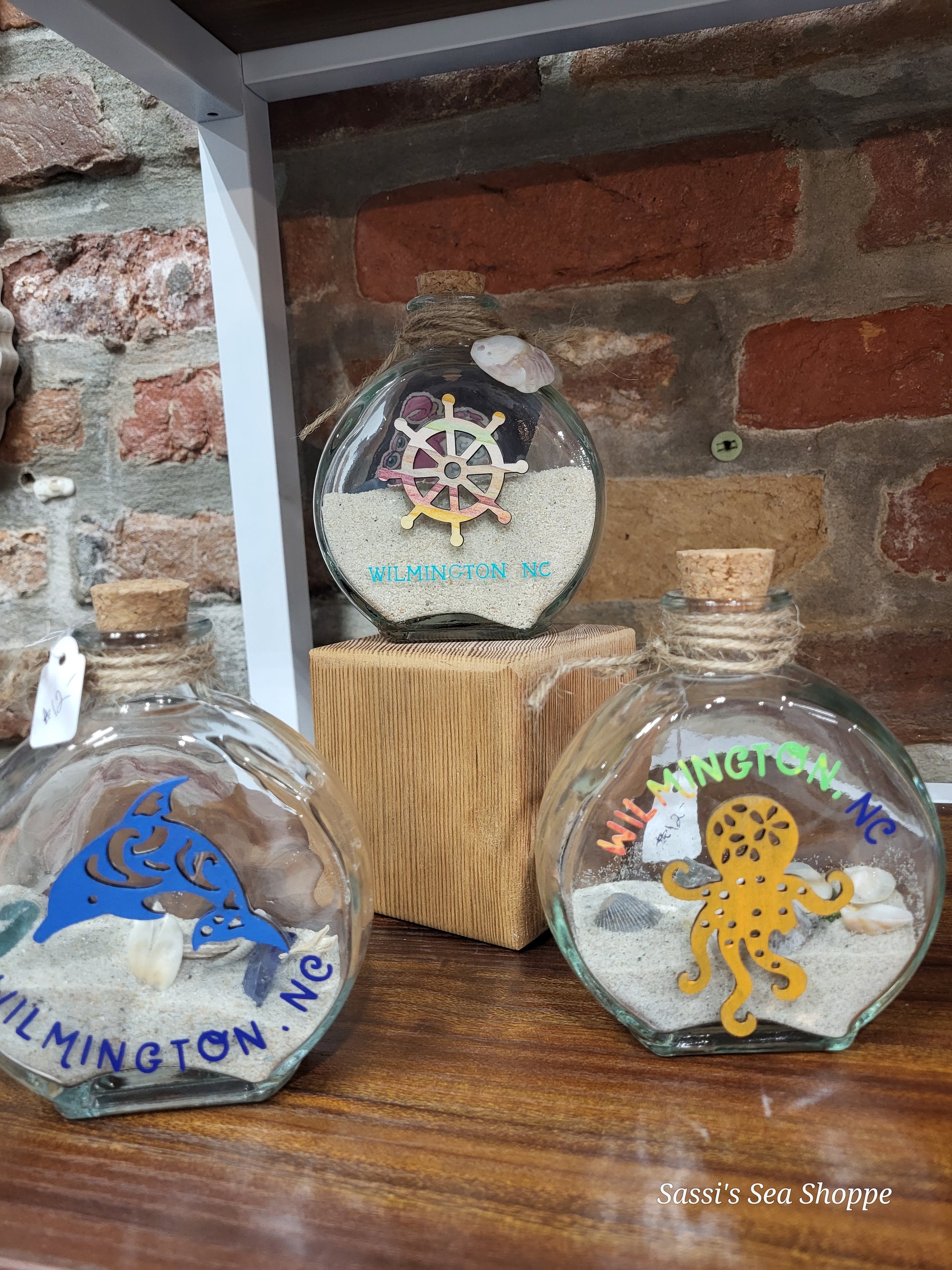 Glass jars filled with an assortment of sand, shells, sea glass and nautical decor.