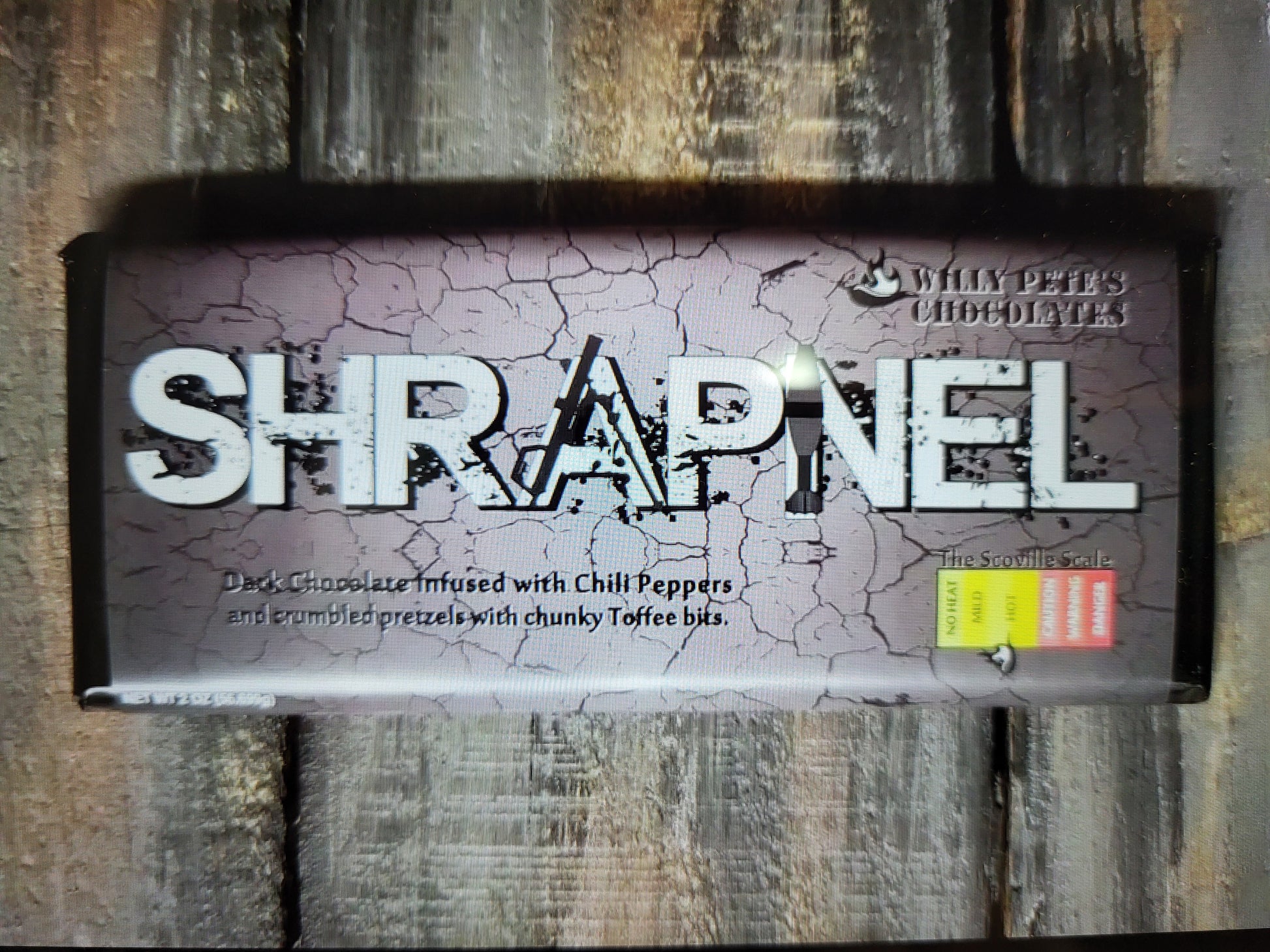 Dark chocolate infused with Chili peppers and crumbled pretzels with chunky toffee bits